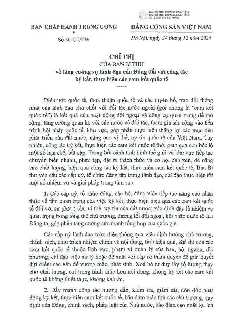 Chỉ thị số 56-CT/TW ngày 24/12/2025 của Ban Bí thư về tăng cường sự lãnh đạo của Đảng đối với công tác ký kết, thực hiện các cam kết quốc tế