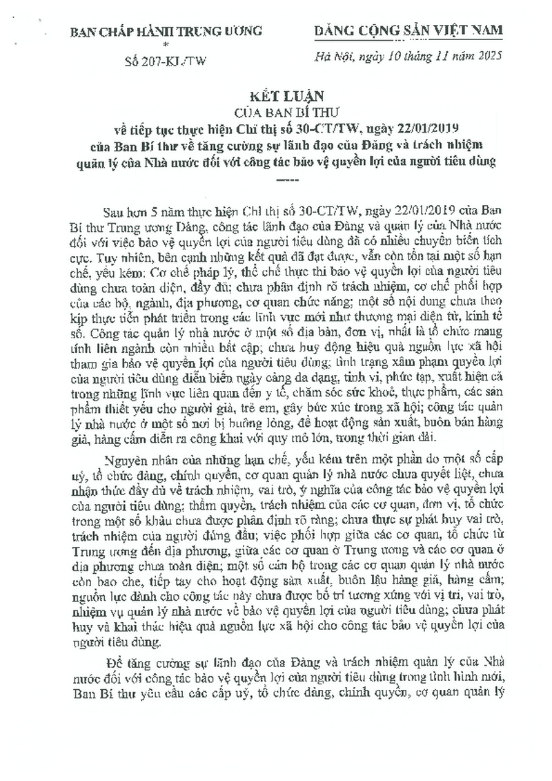 Kết luận số 207-KL/TW ngày 10/11/2025 của Ban Bí thư về tiếp tục thực hiện Chỉ thị số 30-CT/TW, ngày 22/01/2019 của Ban Bí thư về tăng cường sự lãnh đạo của Đảng và trách nhiệm quản lý của Nhà nước đối với công tác bảo vệ quyền lợi của người tiêu dùng