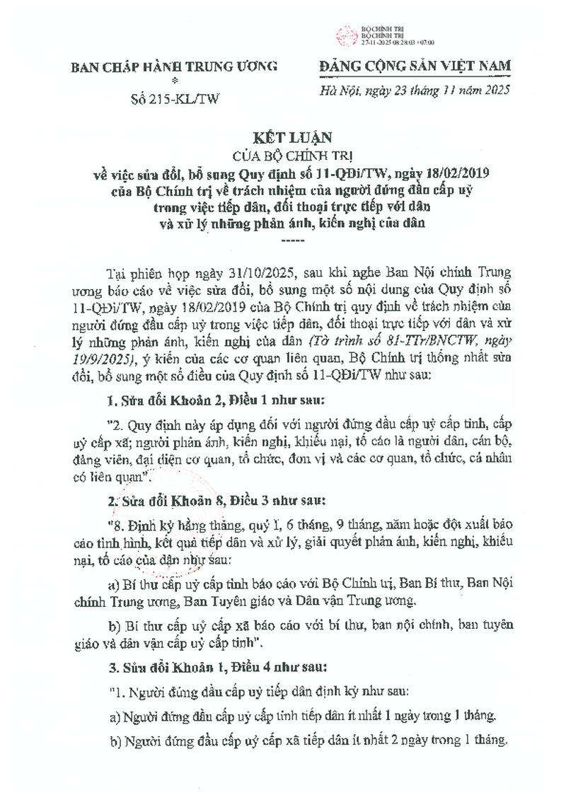 Kết luận số 215-KL/TW ngày 23/11/2025 của Bộ Chính trị về việc sửa đổi, bổ sung Quy định số 11-QĐi/TW, ngày 18/02/2019 của Bộ Chính trị về trách nhiệm của người đứng đầu cấp uỷ trong việc tiếp dân, đối thoại trực tiếp với dân và xử lý những phản ánh, kiến nghị của dân