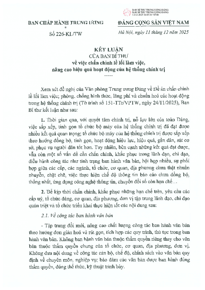 Kết luận số 226-KL/TW ngày 11/12/2025 của Ban Bí thư về việc chấn chỉnh lề lối làm việc, nâng cao hiệu quả hoạt động của hệ thống chính trị