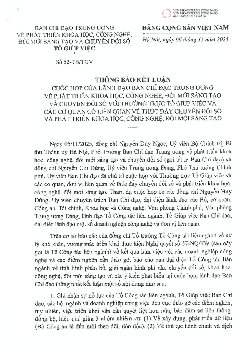 Thông báo kết luận số 52-TB/TGV ngày 06/11/2025 của Tổ giúp việc Ban Chỉ đạo Trung ương về phát triển khoa học, công nghệ, đổi mới sáng tạo và chuyển đổi số (Ban Chỉ đạo Trung ương) tại cuộc họp của lãnh đạo Ban Chỉ đạo Trung ương với Thường trực Tổ giúp việc và các cơ quan có liên quan về thúc đẩy chuyển đổi số và phát triển khoa học, công nghệ, đổi mới sáng tạo