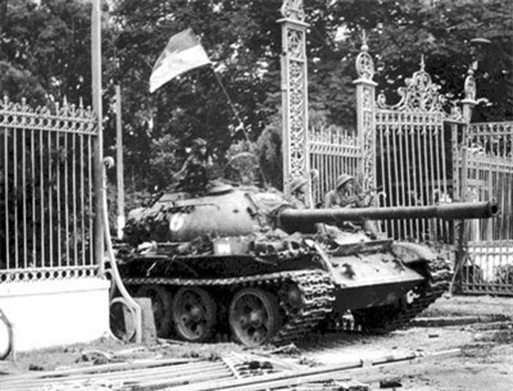 Xe tăng của Quân Giải phóng húc đổ cánh cổng tiến vào Dinh Độc Lập trưa ngày 30/4 (ảnh tư liệu)