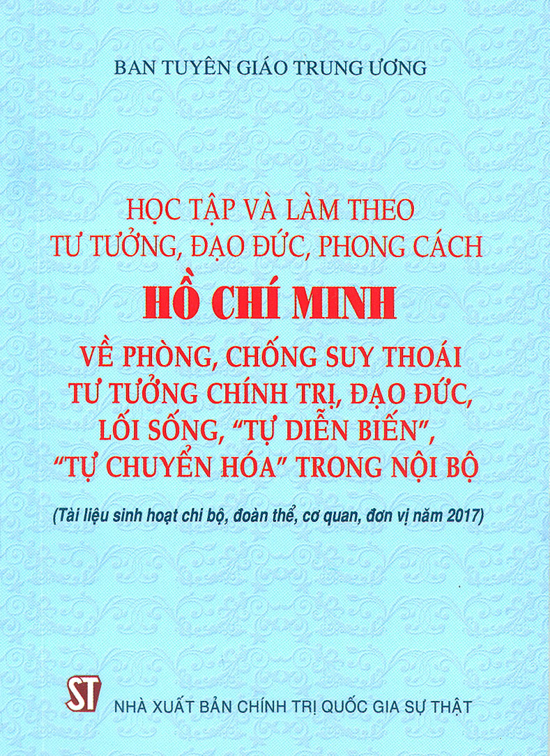 Nhằm triển khai thực hiện nghiêm túc, đồng bộ Chỉ thị số 05-CT/TW của Bộ Chính trị gắn với Nghị quyết Hội nghị lần thứ 4 Ban Chấp hành Trung ương Đảng khóa XII, Ban Tuyên giáo Trung ương phối hợp với Nhà xuất bản Chính trị quốc gia Sự thật xuất bản tài liệu Học tập và làm theo tư tưởng, đạo đức, phong cách Hồ Chí Minh về phòng, chống suy thoái tư tưởng chính trị, đạo đức, lối sống, “tự diễn biến”, “tự chuyển hóa” trong nội bộ (Tài liệu sinh hoạt chi bộ, đoàn thể, cơ quan, đơn vị năm 2017).